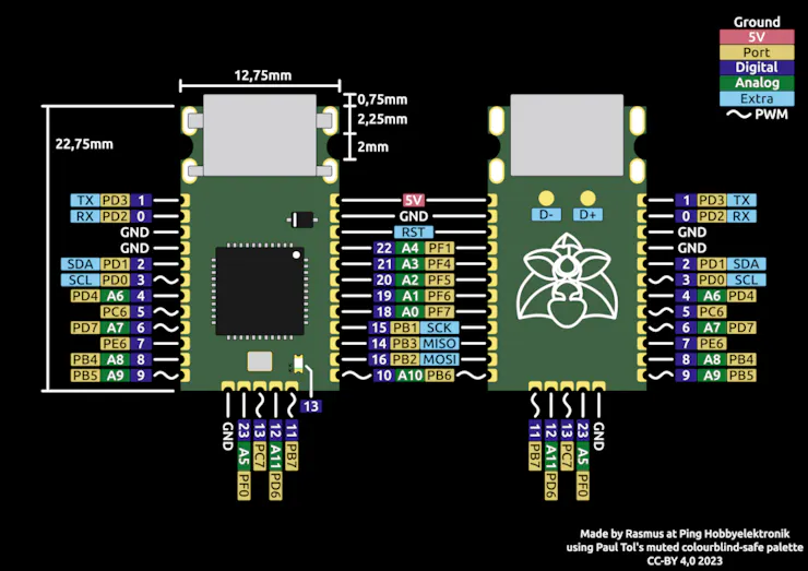 | Epi 32U4 | Ping Hobbyelektronik | 22,75 x 12,75 mm | Oui | Oui | 23 | Non | Fusible, ESD, Filtre à ferrite | Oui | Oui | Bientôt | 25 $ |