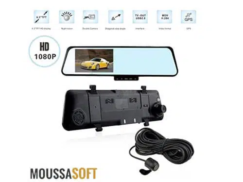 Doté de deux objectifs Full HD 1080p / VGA, d’un détecteur de choc G-sensor et d’un écran 4,3″ 16:9. Cette caméra rétroviseur boite noire HD enregistrera tout ce qui se déroulera à l’avant de votre véhicule comme à l’arrière. Les enregistrements vidéo et audio sont stockés sur la carte mémoire (non incluse). Cette caméra DVR enregistre en boucle votre trajet et sécurise les données en cas d’imprévus.
