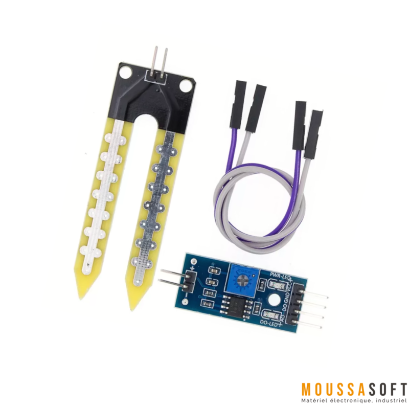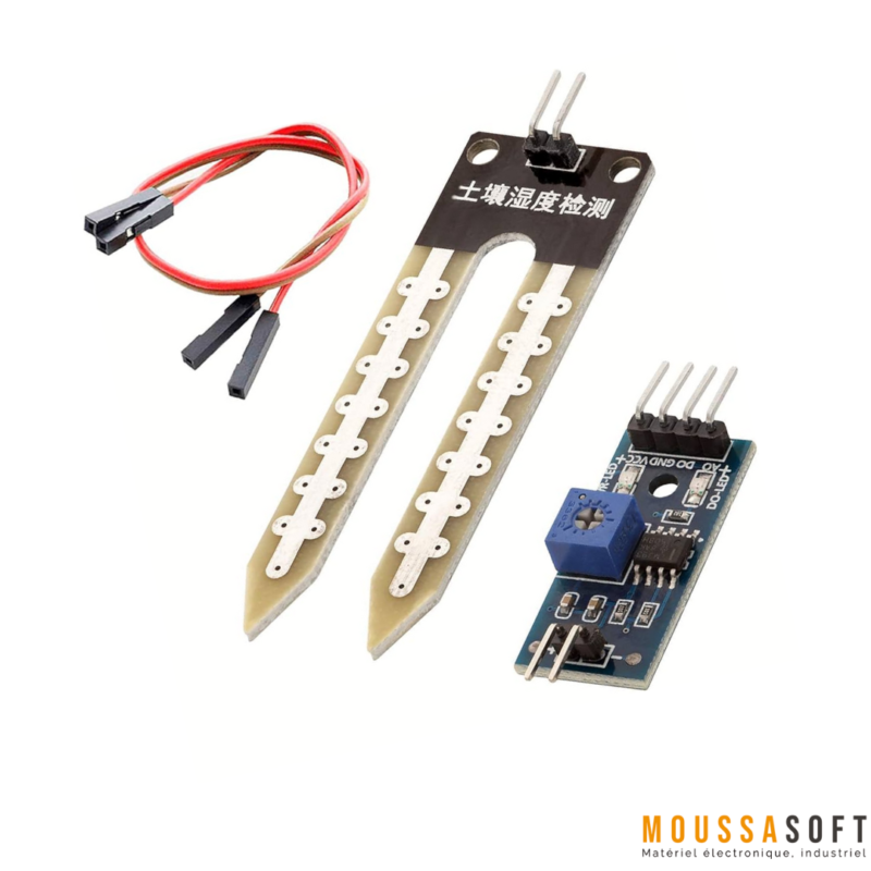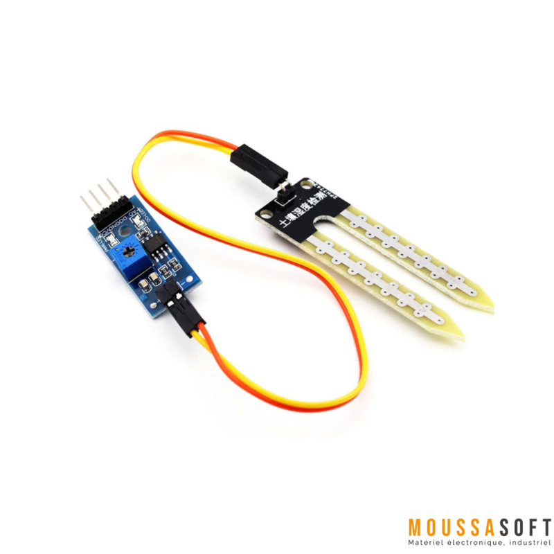 Ce capteur d’humidité  permet de connaître la concentration d’eau dont le sol à partir des changements de conductivité électrique de la terre , il possède un potentiomètre qui permet le déclenchement d’une alarme pour l’activation d’un système d’arrosage par exemple .