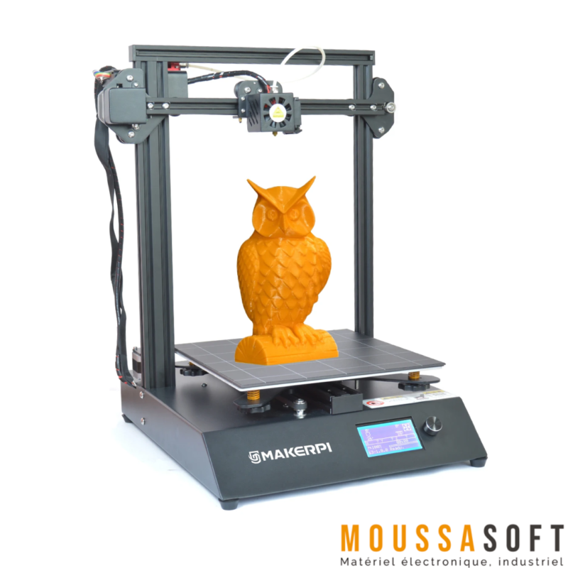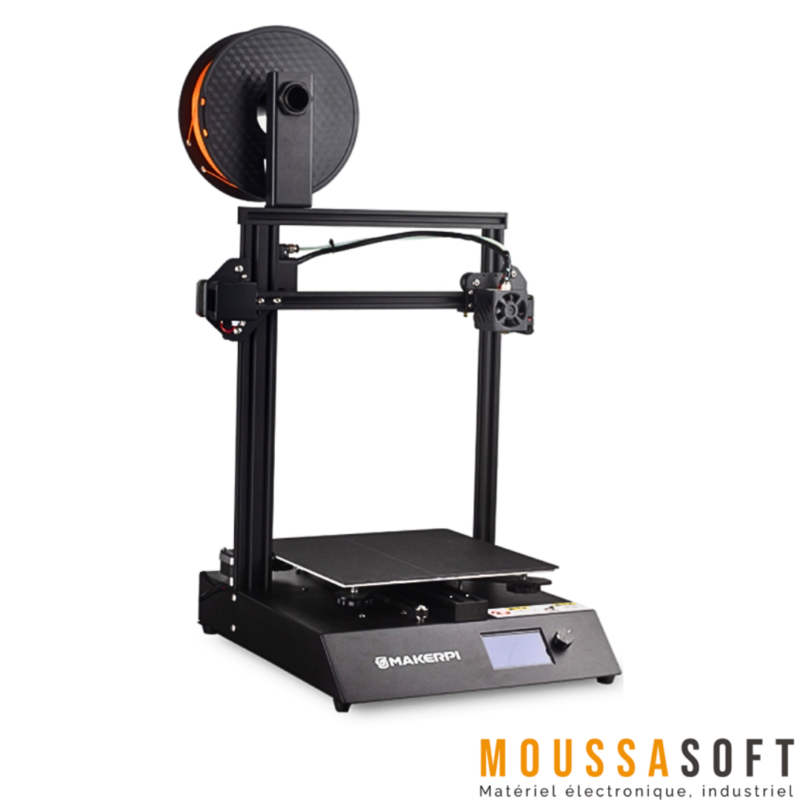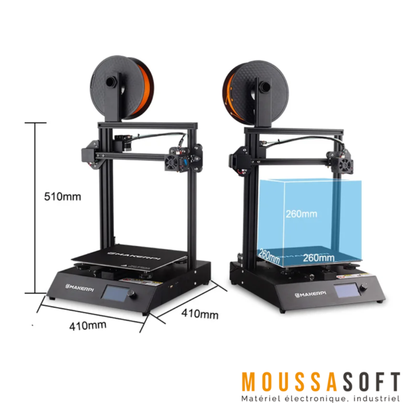 Maker Pi 2 offre une taille d’impression de 260 x 260 x 260 mm, ce qui permet de réaliser des objets de taille moyenne avec une bonne résolution. Son extrudeuse peut atteindre une température maximale de 260°C, ce qui la rend compatible avec divers matériaux comme le PLA, PETG, ABS, et plus encore. La plate-forme d’impression est équipée d’un lit chauffant pouvant monter jusqu’à 110°C, permettant une excellente adhésion des modèles.
