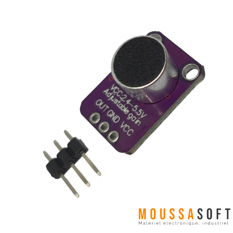Le module MAX4466 est livré avec une tête de broche mâle pour faciliter sa connexion à d’autres composants.