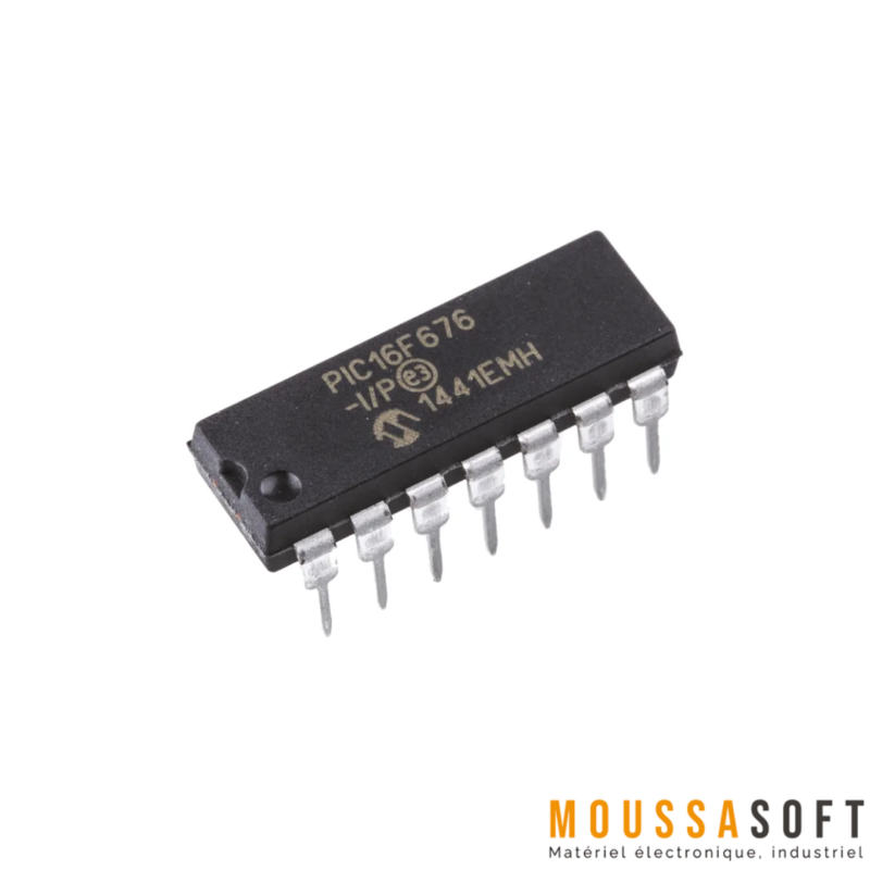 PIC16F676 Microcontrôleur fonctionnant à une fréquence d’horloge de 20 MHz, il dispose de 1.75 KB de mémoire flash et de 64 octets de RAM. Avec ses 12 broches I/O, ce microcontrôleur permet facilement d’interfacer divers capteurs et actuateurs.