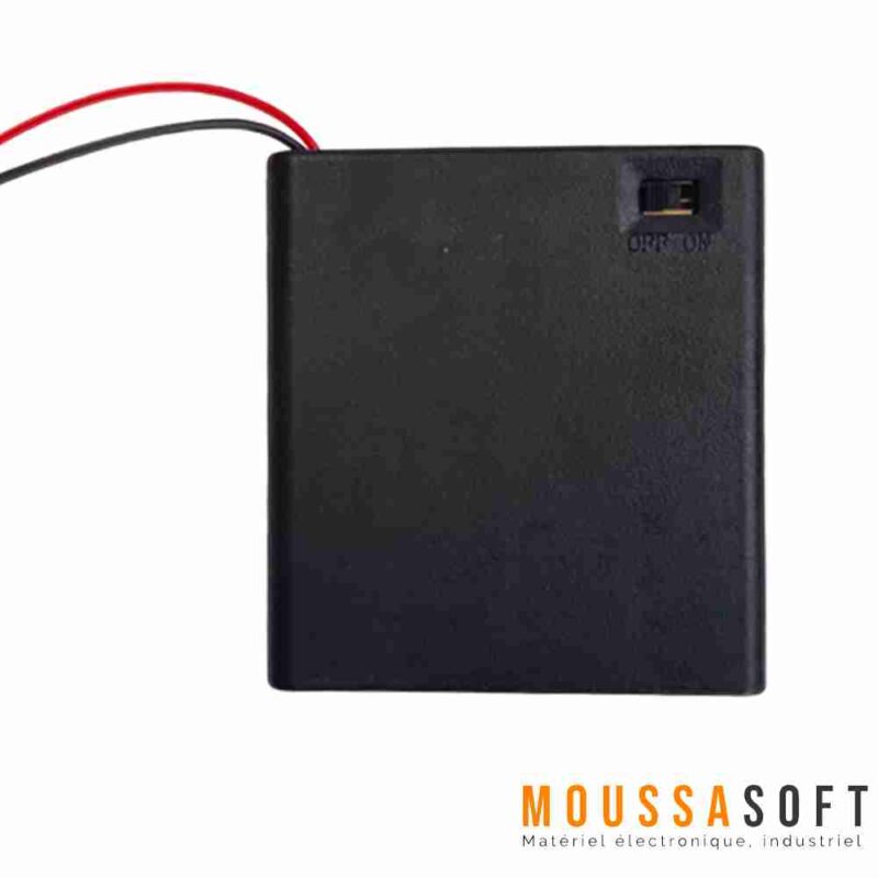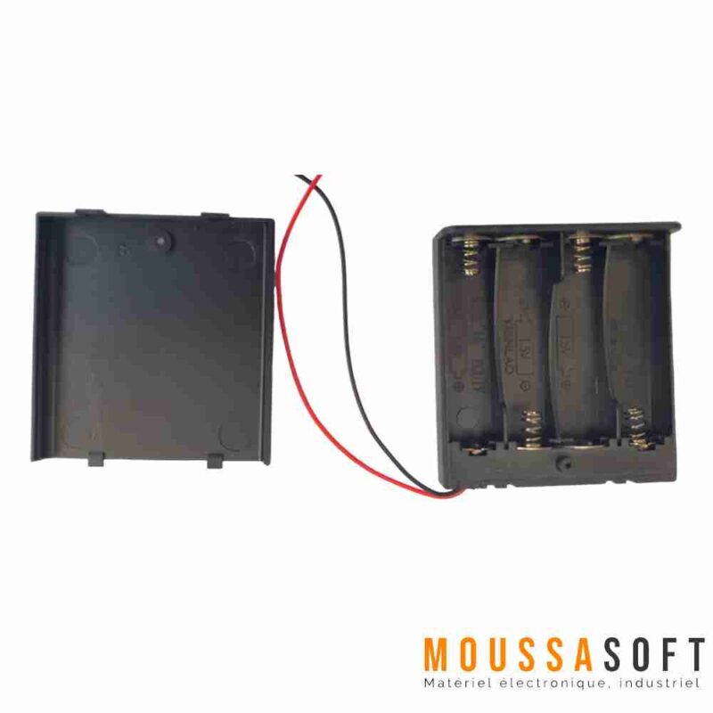 Porte piles 4 x AA Batterie est un dispositif qui permet de maintenir en place quatre piles AA (LR6) dans un compartiment prévu à cet effet. Il est souvent utilisé pour alimenter des appareils électroniques tels que des télécommandes, des jouets, des lampes de poche et bien d’autres.