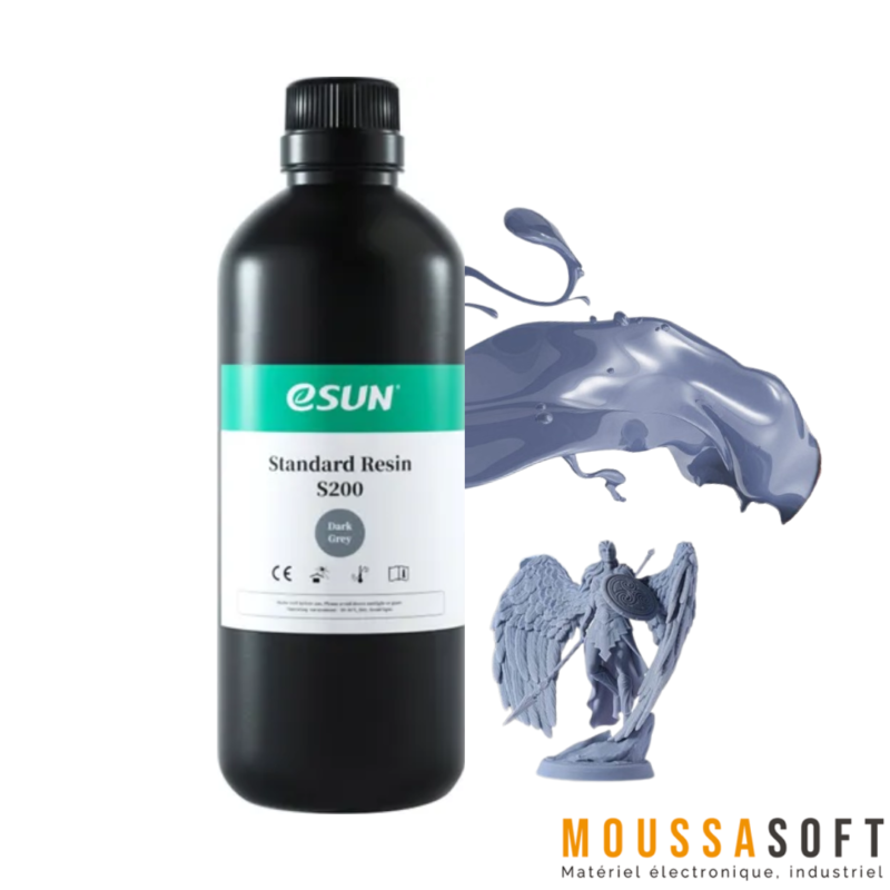 La Résine Standard S200 Gris Foncé en teinte gris foncé de eSUN est une résine destinée à des impressions 3D de haute précision et rigidité. Conçu pour offrir une qualité de surface fine avec des textures claires, ce produit s’avère particulièrement utile pour des applications nécessitant des détails minutieux et des surfaces lisses.
