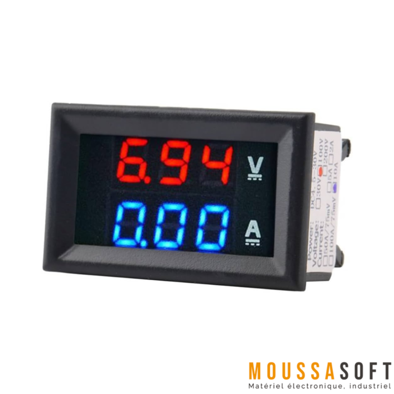 Voltmètre Ampèremètre Digital 100V 10A permet de mesurer et afficher simultanément la tension (0,0V à 100V) et le courant (0A à 10A) dans les circuits DC.